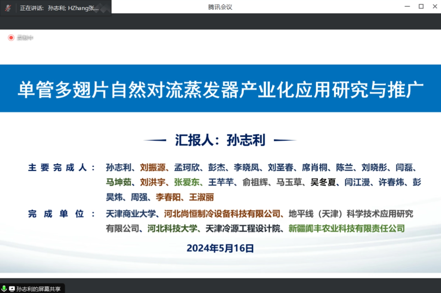 公司的项目完成人员为:孙志利、刘圣春、李晓凤、席肖桐、陈兰、刘晓彤、吴冬夏。孙志利教授作为项目负责人进行了工作汇报,详细介绍了单管多翅片自然对流排管蒸发器的研制背景、开发历程、社会意义、关键技术、成果、样机制作和应用推广。