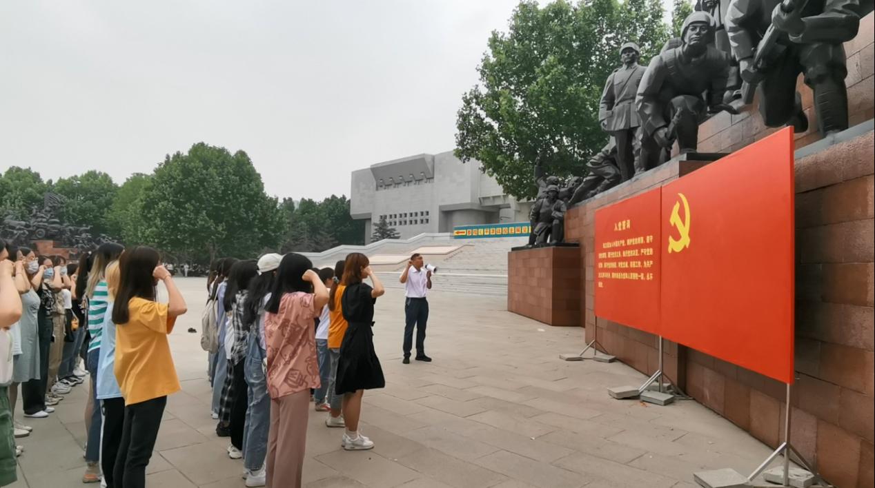 随后,预备党员们按照顺序参观了纪念广场、胜利花园、展览馆等。参观结束后,在纪念馆广场上的主题雕塑前,张书记带领着预备党员们面向鲜红的党旗,举起右拳,做出庄严宣誓,“我志愿加入中国共产党,拥护党的纲领,遵守党的章程……”。铿锵整齐的宣誓声在平津战役纪念馆胜利广场回荡。