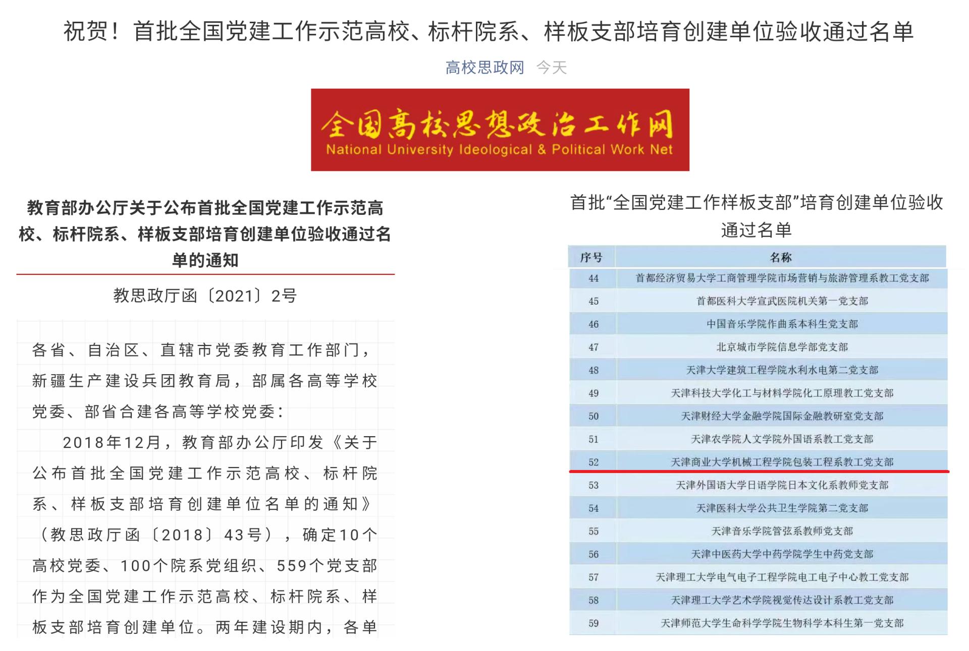 近日,教育部办公厅印发了《关于公布首批全国党建工作示范高校、标杆院系、样板支部培育创建单位验收通过名单的通知》(教思政厅函[2021]2号),永利yl23411包装工程系教工党支部全国党建工作“样板支部”培育创建单位顺利通过验收。